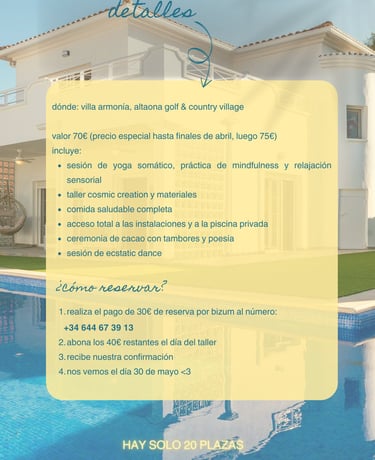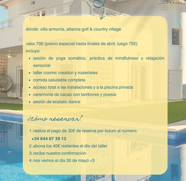 Yoga Somático. Mindfulness Body Sensations Comida, Piscina y Mercadillo. Cosmic Creation . Relajación Sensorial.Ceremonia de Cacao con Tambores y Poesía | Apertura emocional. Una experiencia ancestral para conectar con el ritmo de la tierra. Ecstatic Dance